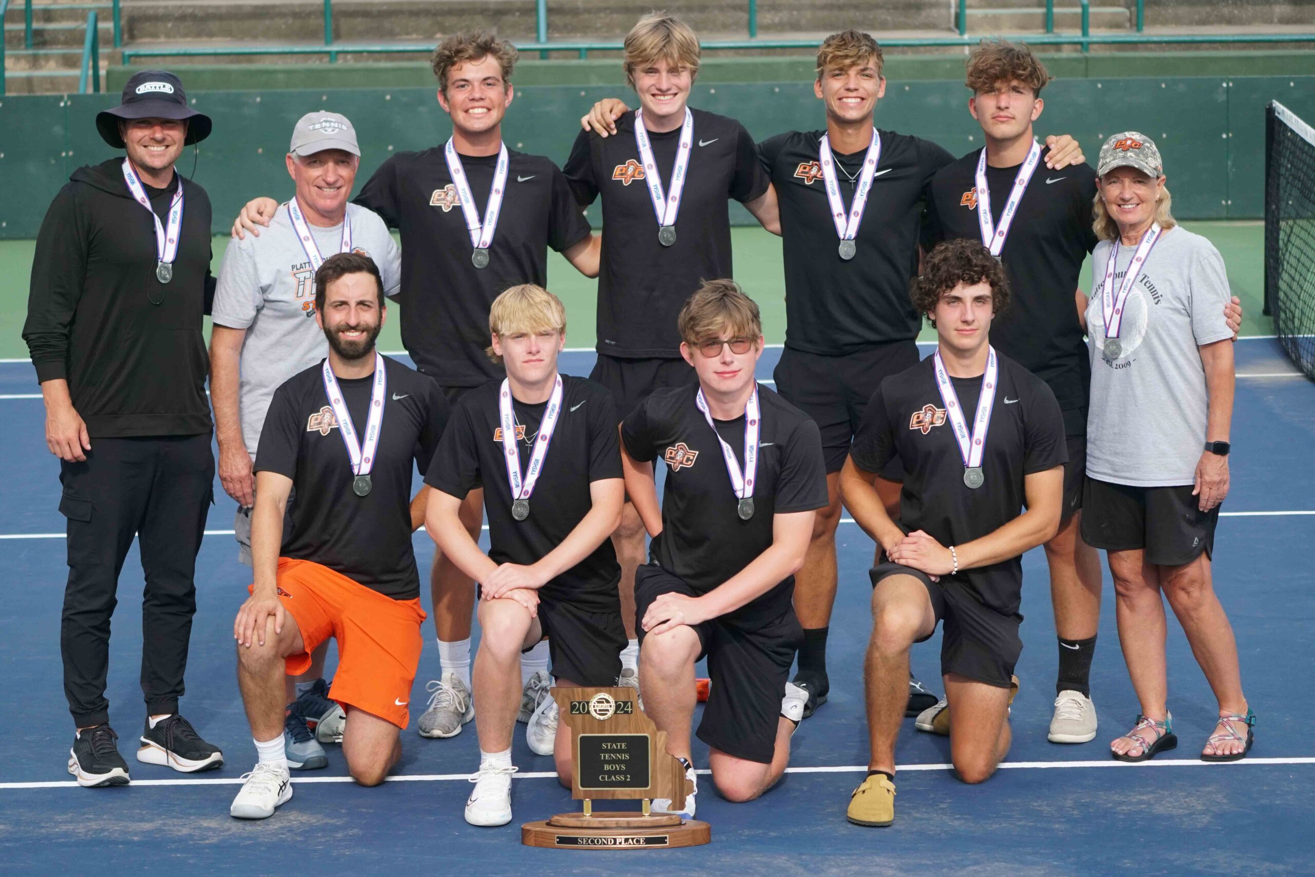 Platte County’s players and coaches pose with the Class 2 second-place trophy Friday at Cooper Tennis Complex in Springfield.