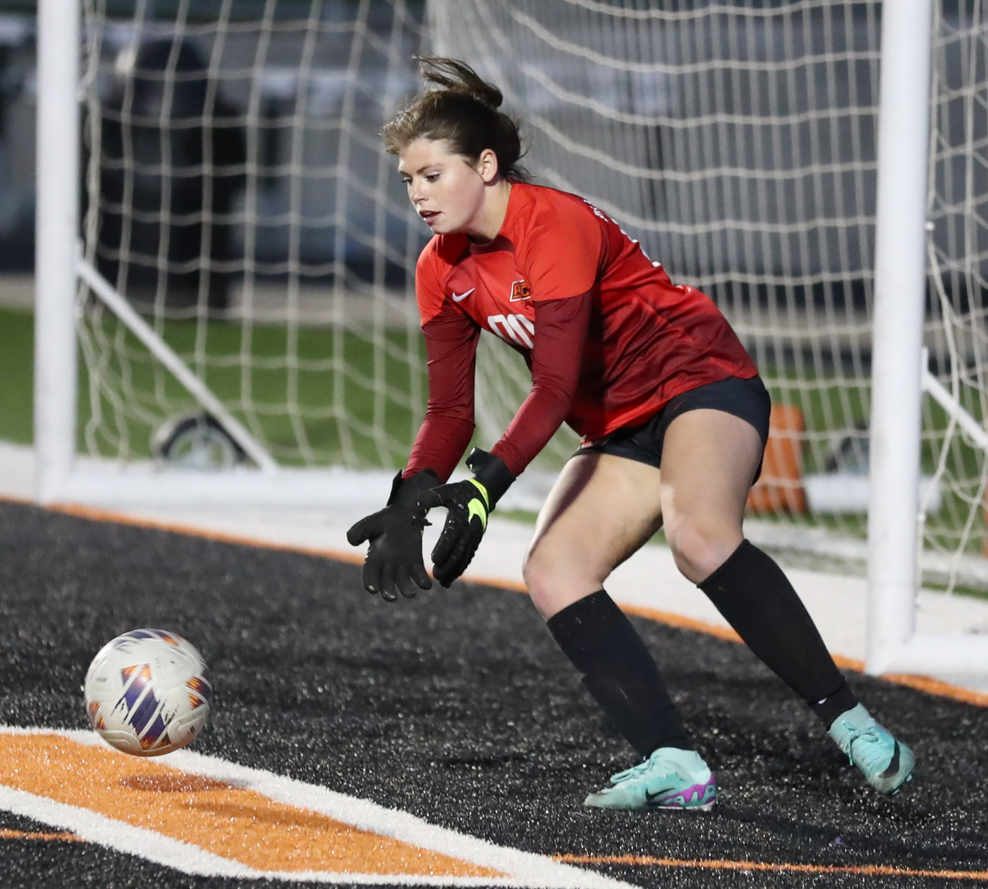 Platte County junior goalkeeper Finley Kaser goes to scoop up a loose ball against Grain Valley on Thursday at Pirate Stadium.