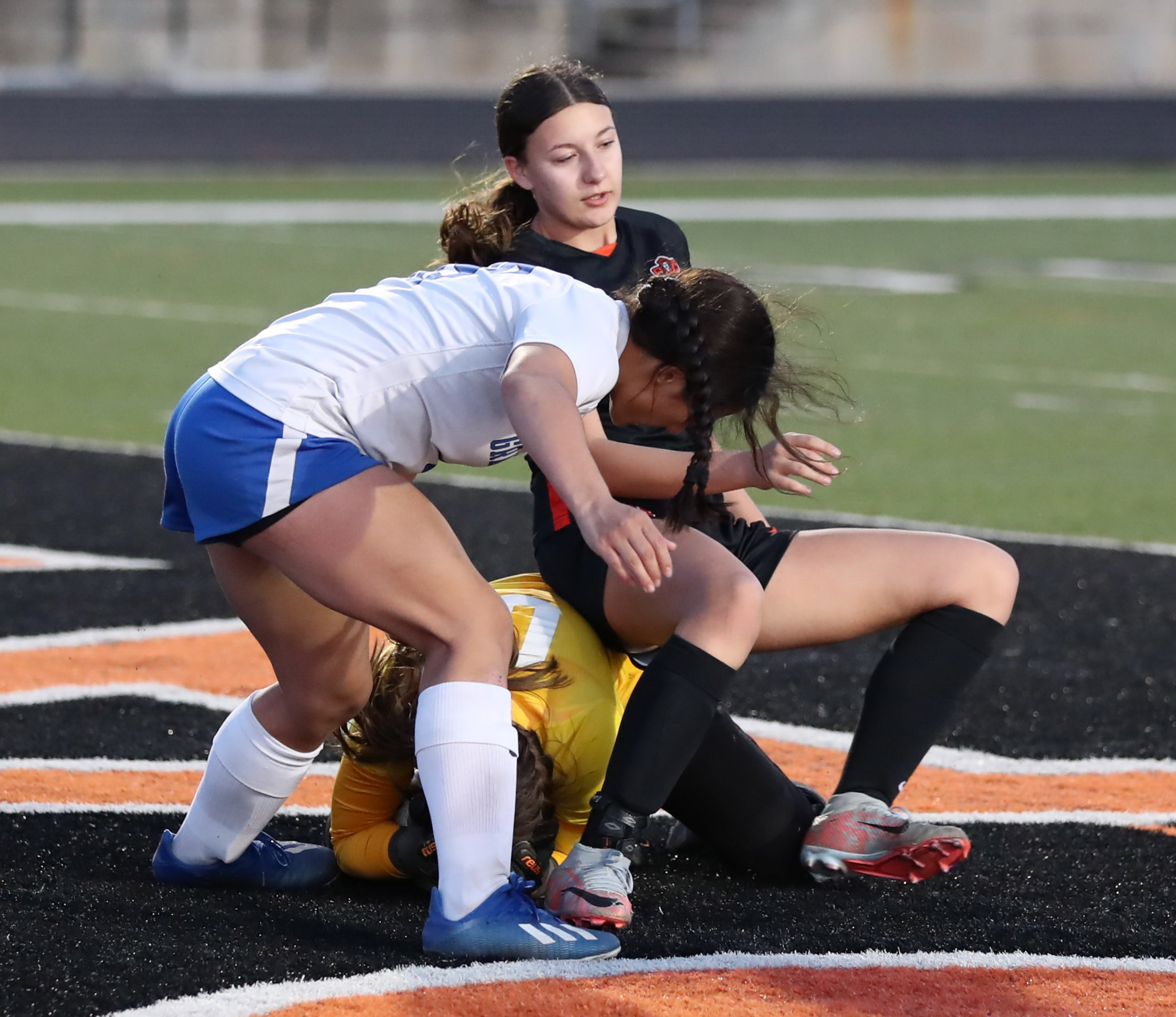 Platte County sophomore midfielder Saige Dickens collides with the Grain Valley goalkeeper in Thursday’s game at Pirate Stadium.