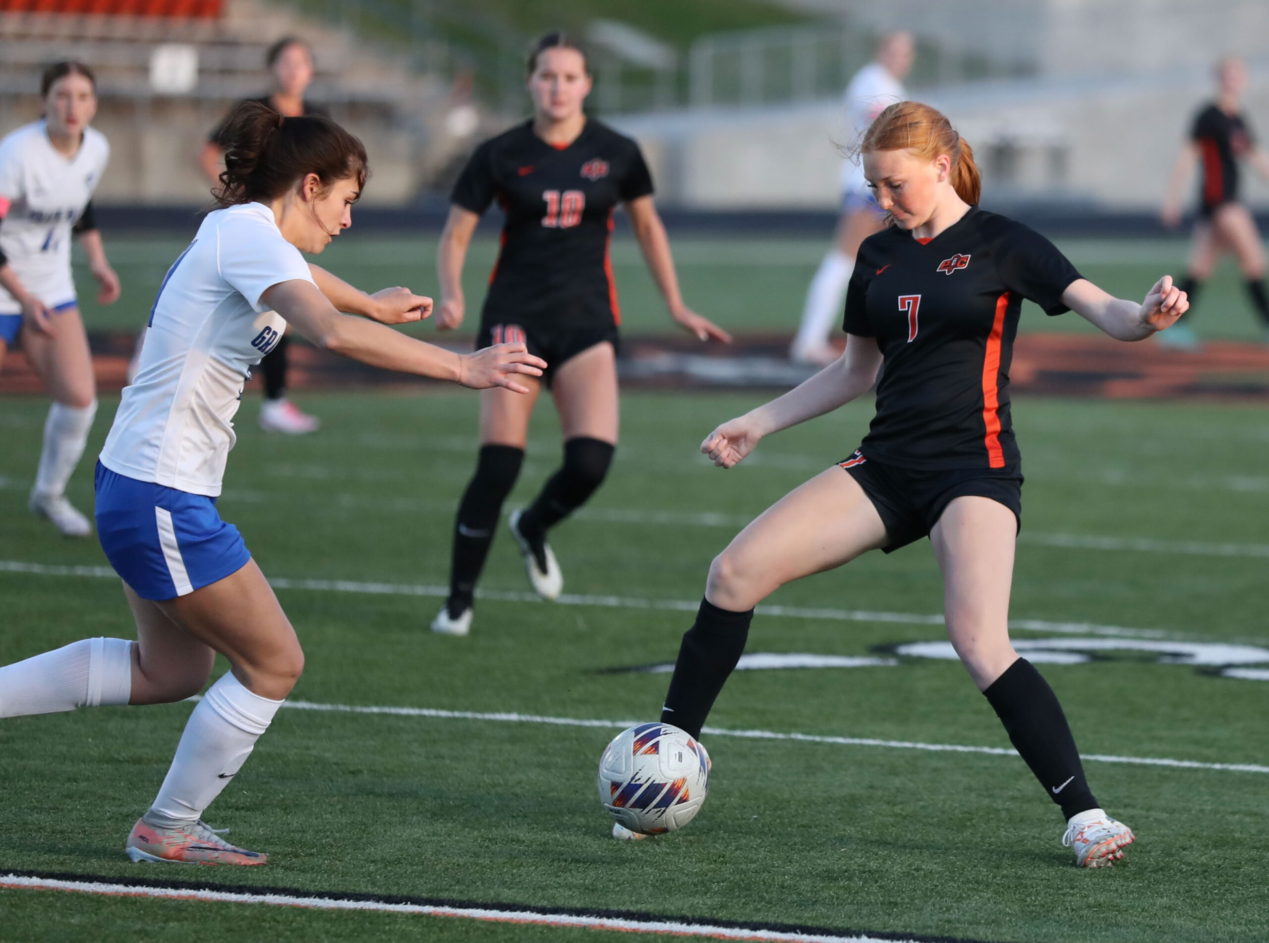 Orellana finished off the scoring in the 78th minute with her second goal of the season. Sloan played a ball back to her near the corner of the 18-yard box on the right, and she sent in a left-footed ball that might have been intended as a cross only to softly loop into the far side netting for Platte County’s third highlight-reel goal of the game.