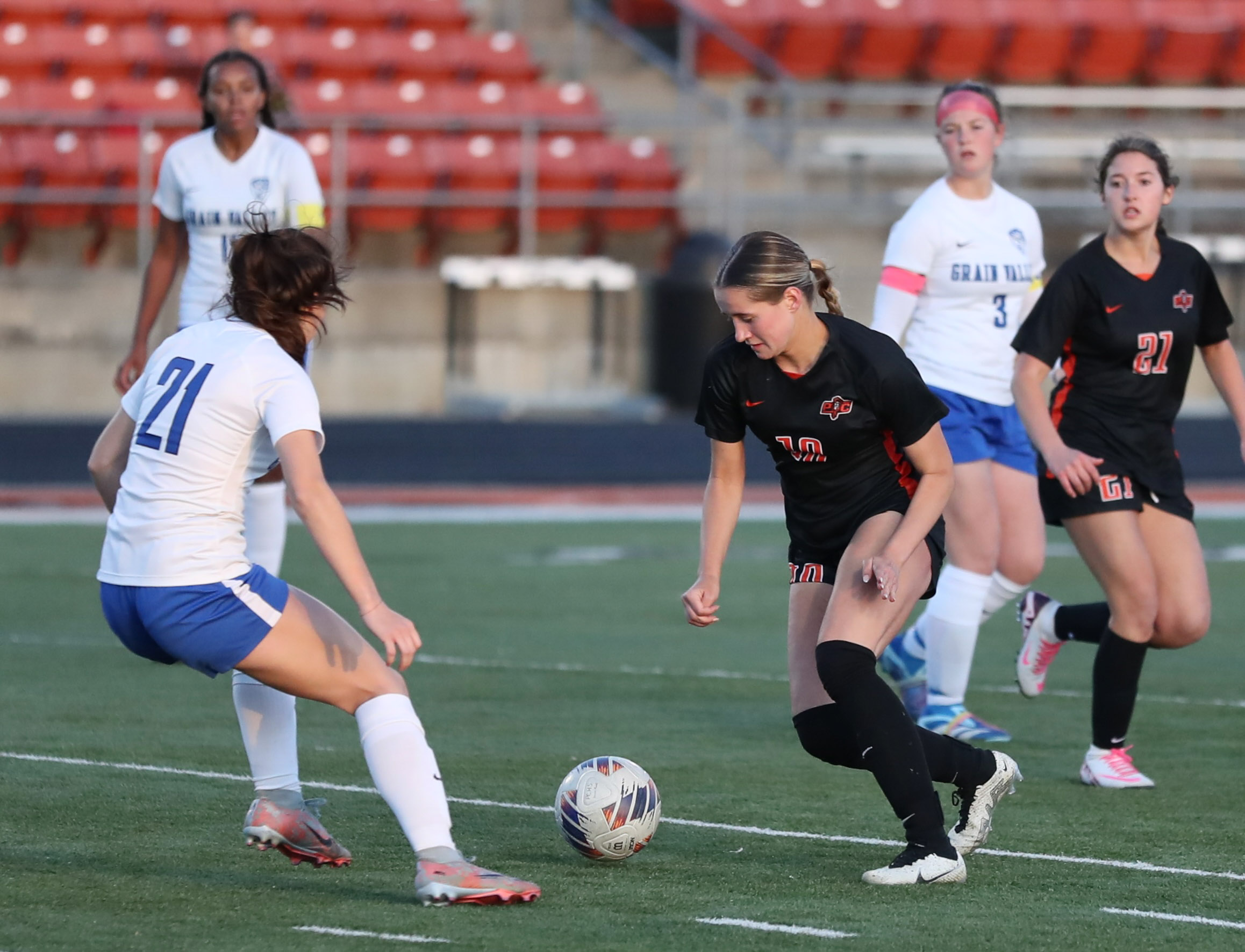 Set pieces continued to cause trouble for Platte County with Grain Valley junior Kyra Osabuohien sending a header off a corner kick wide in the 16th minute. The Eagles then doubled their lead in the 44th minute, shortly out of halftime, on a free kick crossed into the box to find sophomore Radleigh Childers for the second goal.