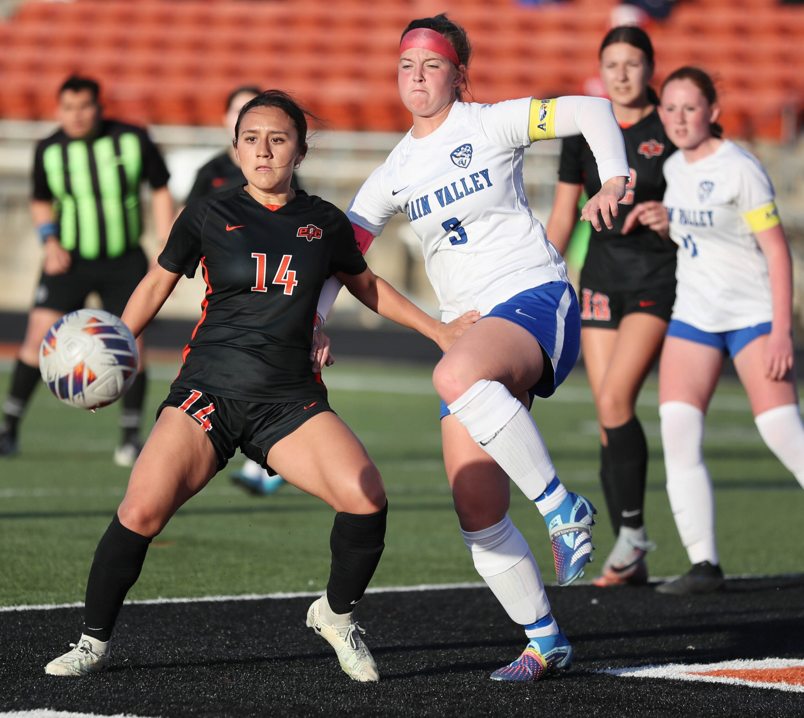 Platte County senior midfielder Marissa Orellana battles for position on a corner kick against Grain Valley on Thursday at Pirate Stadium.