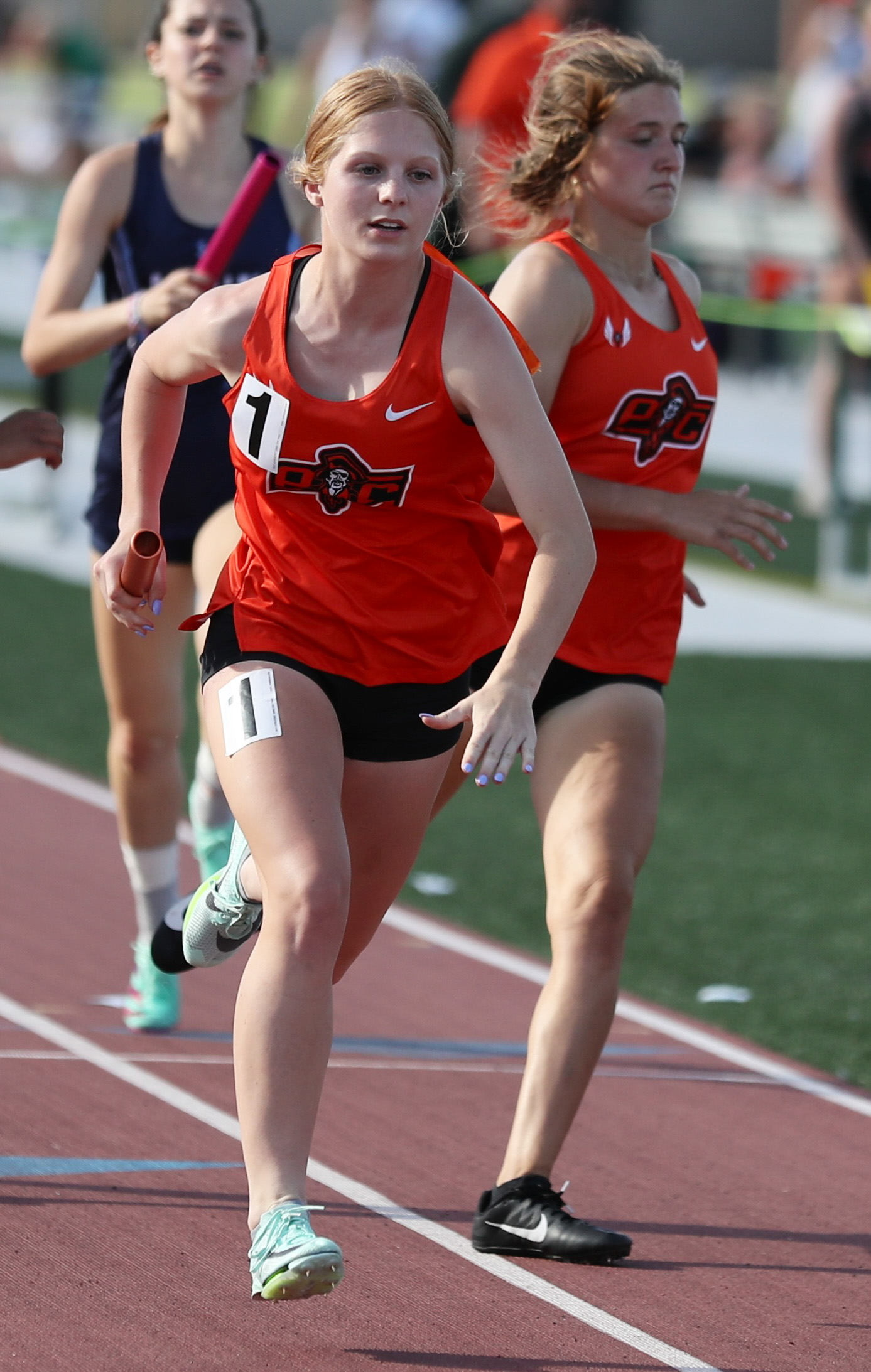 Platte County sophomore Madison Palmer takes the baton for the anchor leg of the 4×400-meter relay during the Class 5 District 8 meet Saturday at North Kansas City District Activities Complex in Kansas City.
