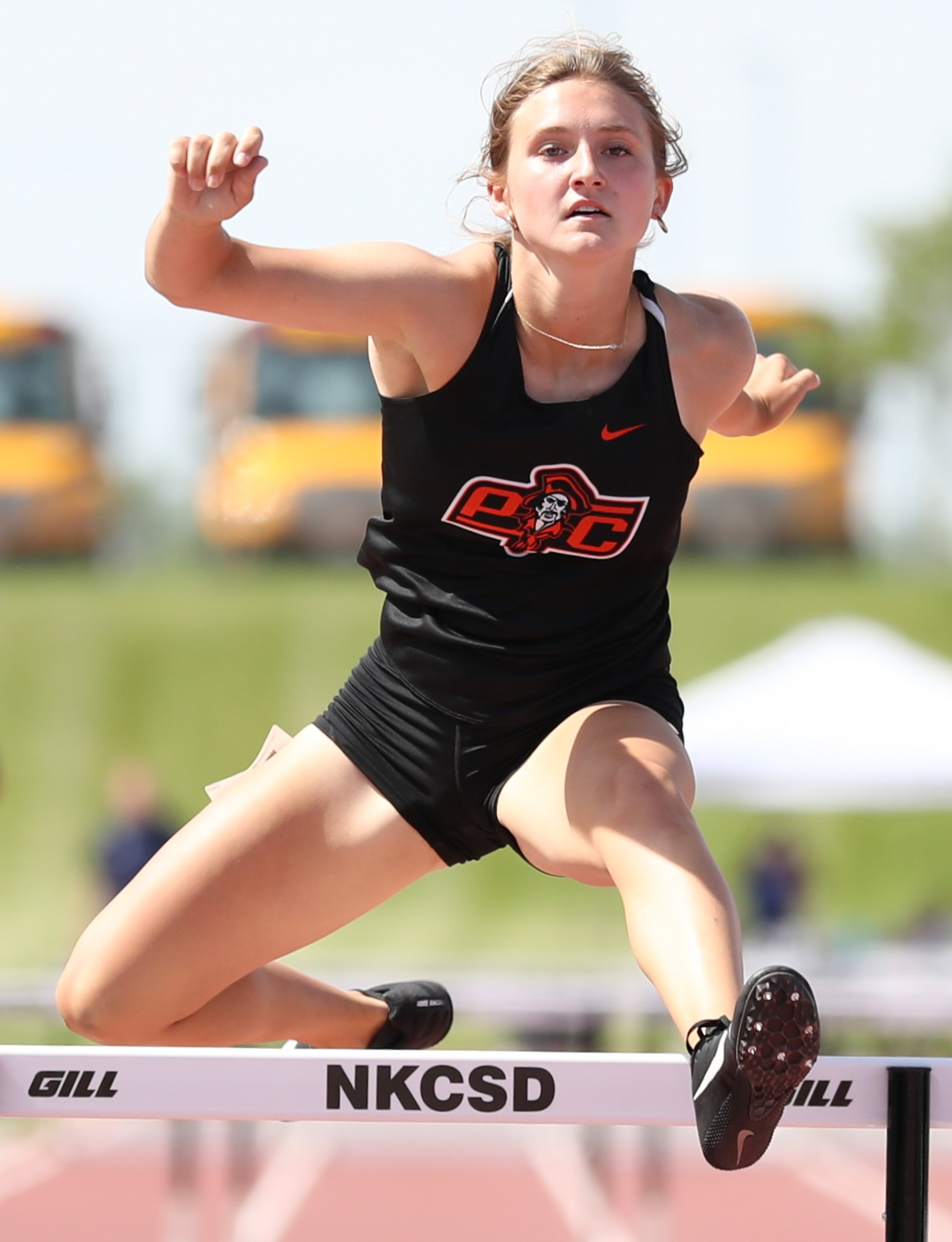 Platte County junior Ava Filger competes in the 300-meter hurdles during the Class 5 District 8 meet Saturday at North Kansas City District Activities Complex in Kansas City.