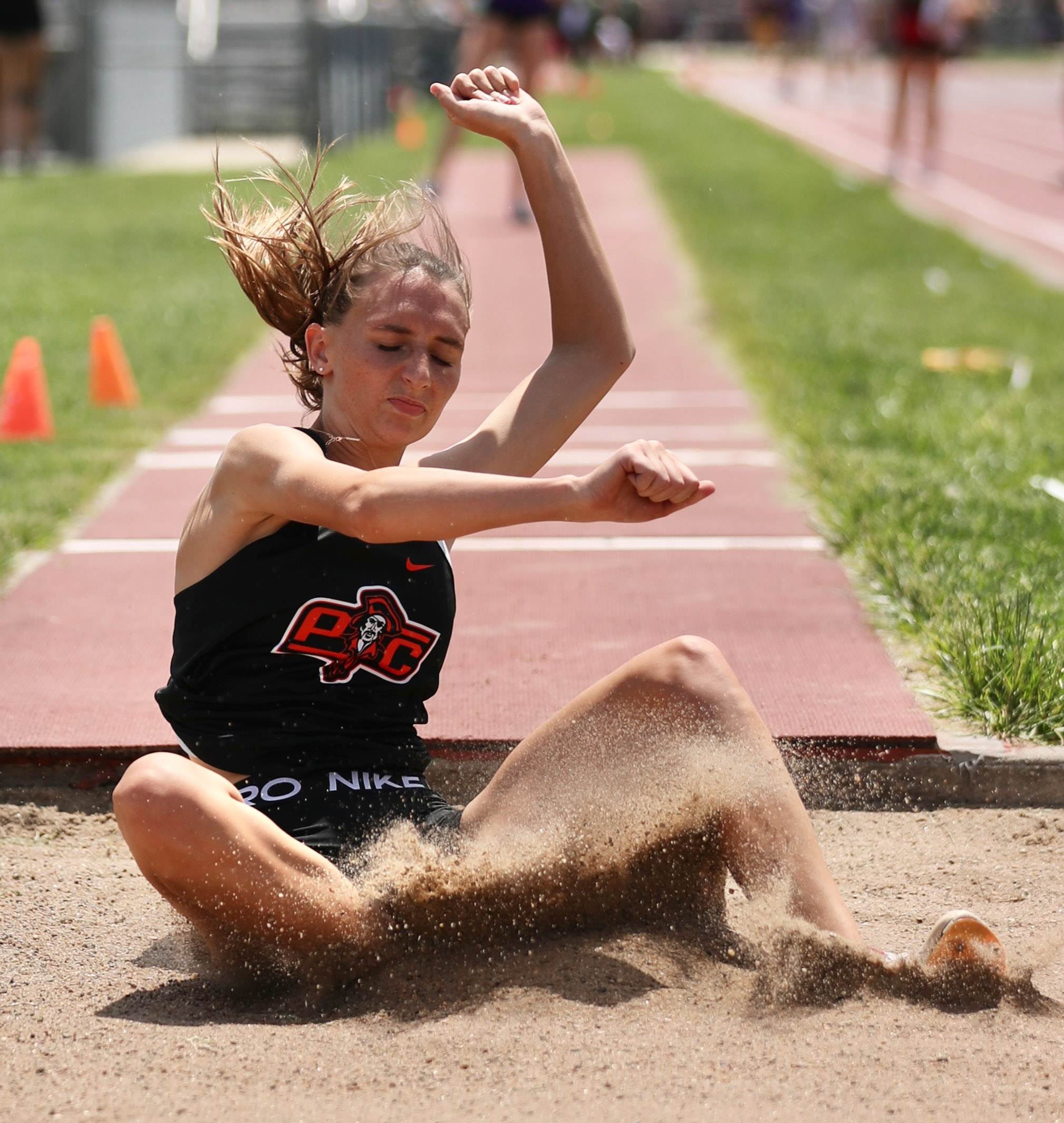 Platte County senior Reese Pickett hits the sand on a triple jump attempt during the Class 5 District 8 meet Saturday at North Kansas City District Activities Complex in Kansas City.