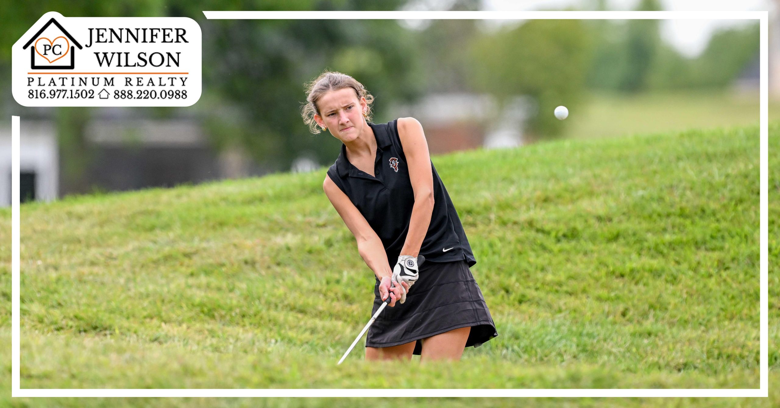 Platte County sophomore Finnley Dougan hits a chip shot during the Dottie Drukker Memorial Two-Person Scramble on Tuesday at Tiffany Greens Golf Course in Kansas City.