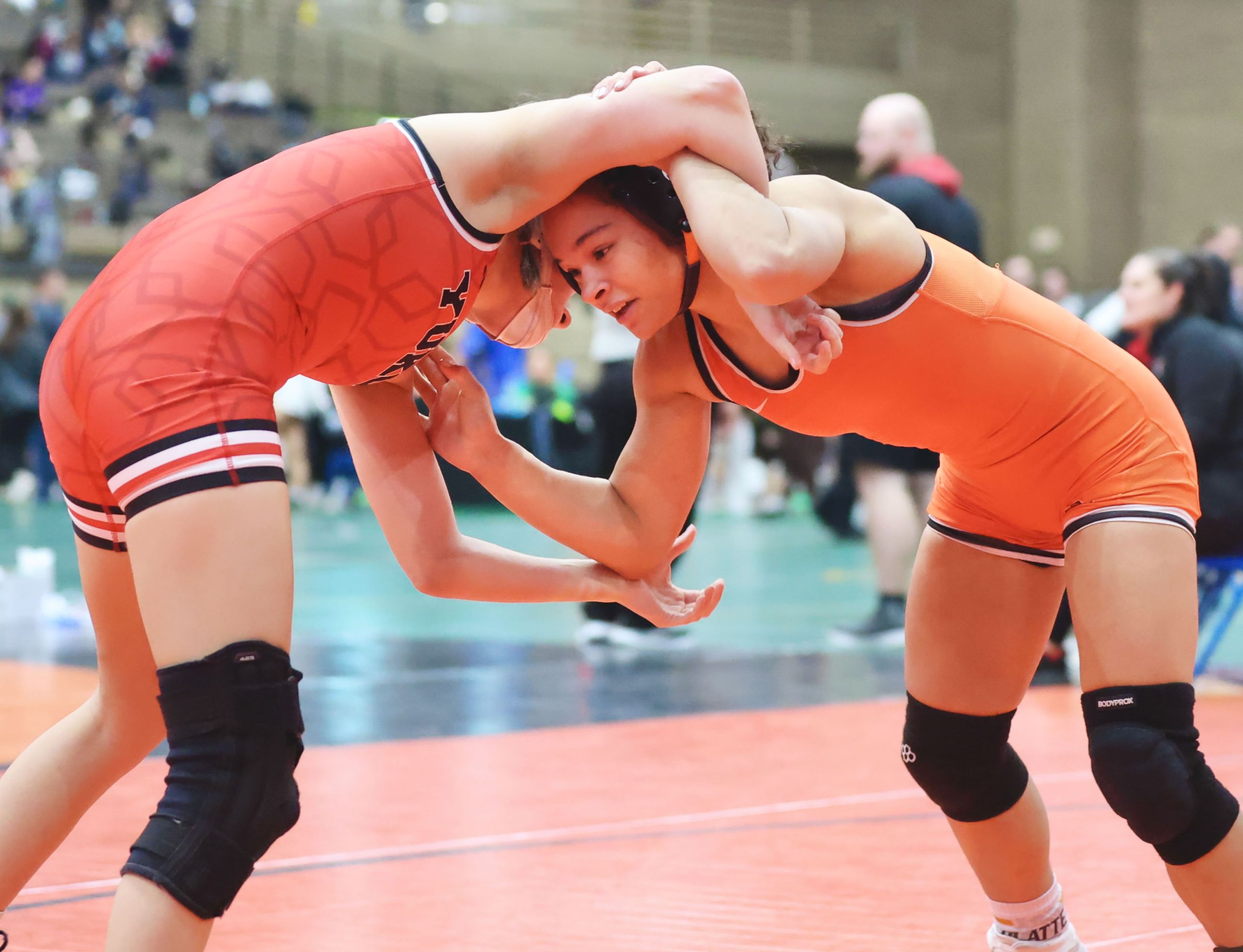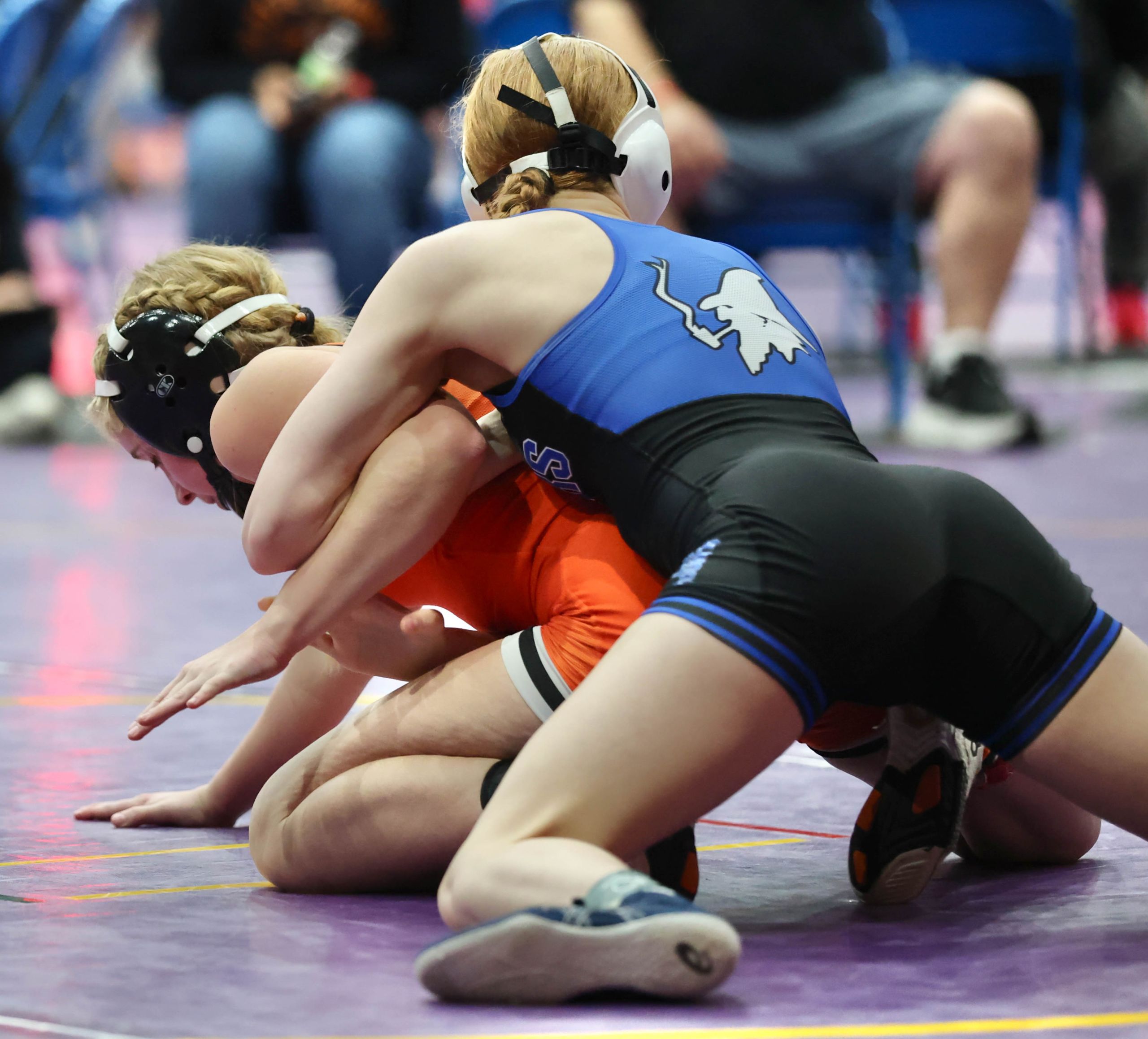 Platte County freshman Mattie Blankenship wrestles in a 135-pound match during the KC Stampede Tournament on Thursday at Hale Arena in Kansas City, Missouri.