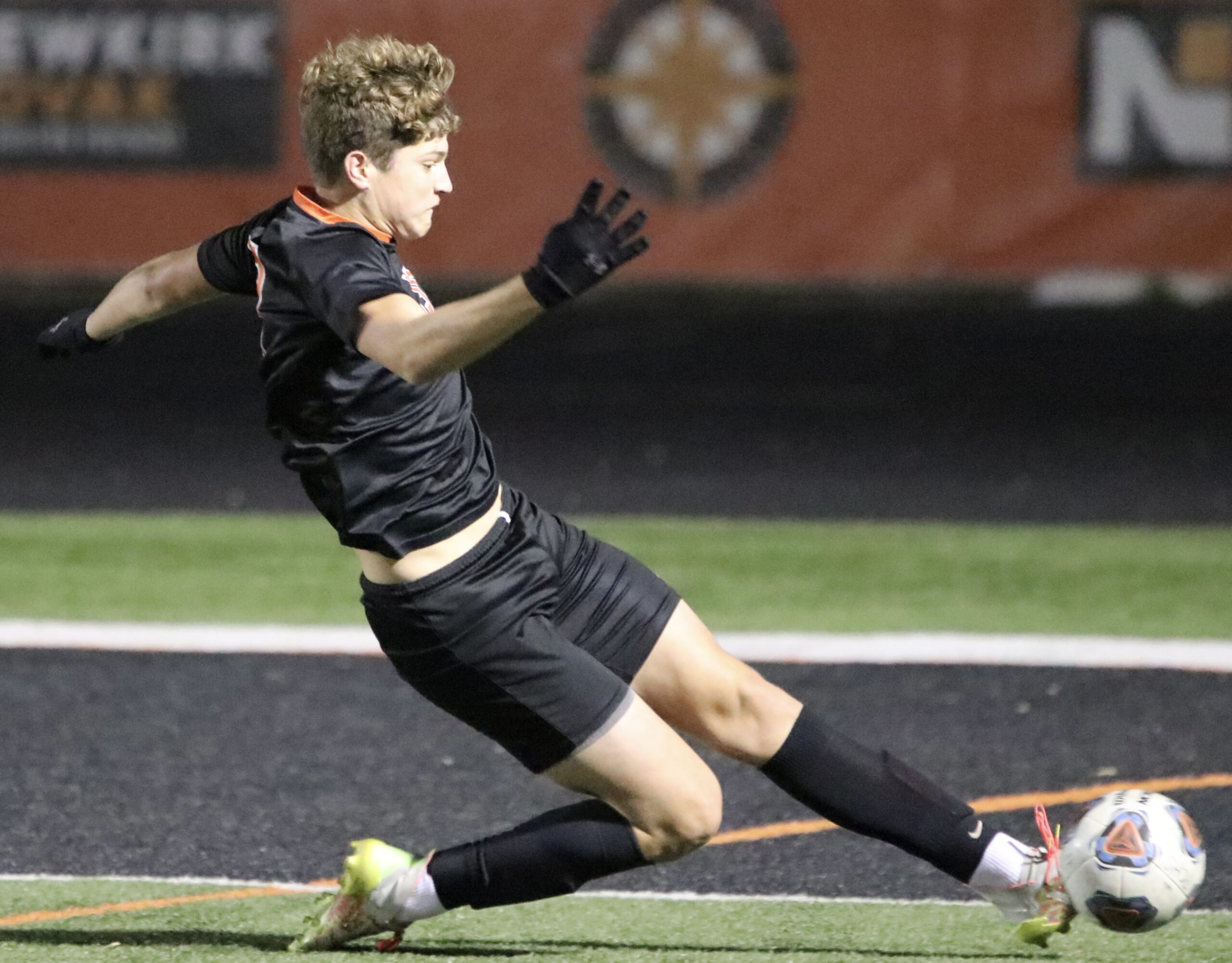 Platte County senior defender Isaac Havemeier slides to knock the ball out of play against Smithville on Monday at Pirate Stadium.