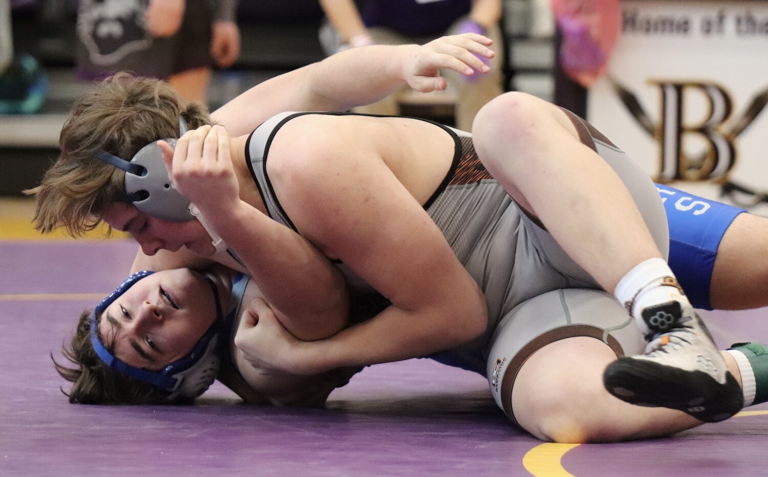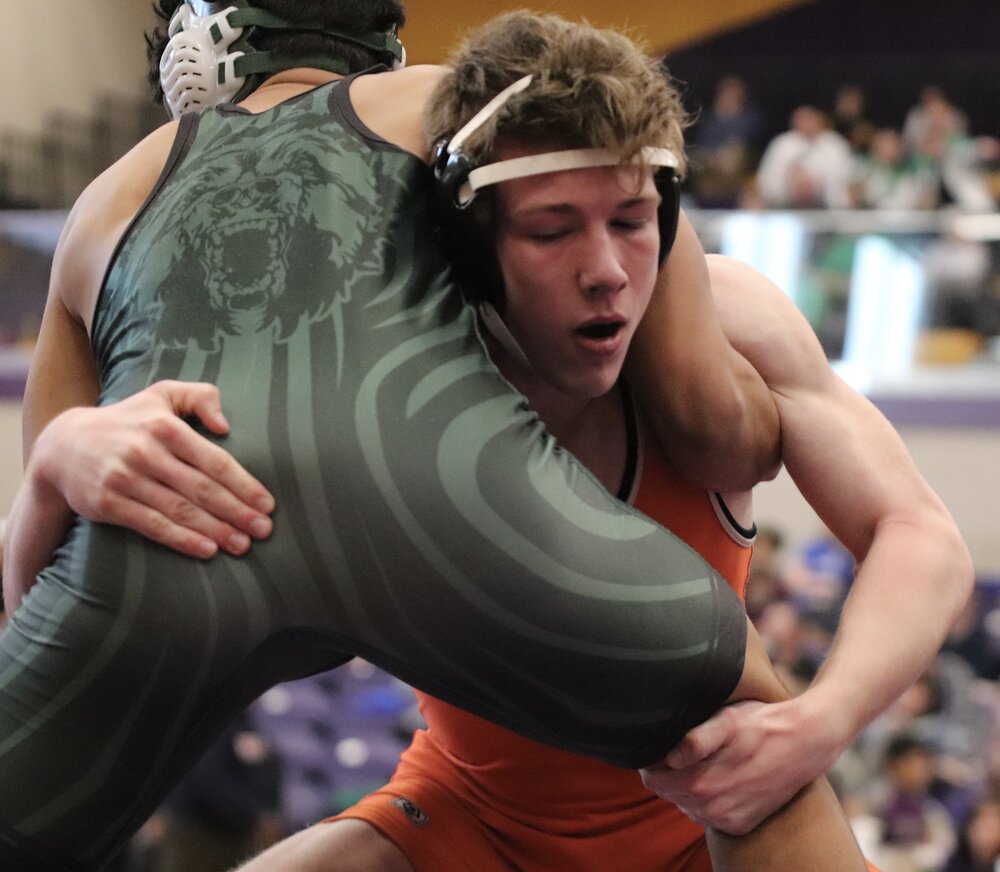 Platte County senior Jesse Schillinger goes for a pin during a Class 3 District 4 match last season at Belton High School.